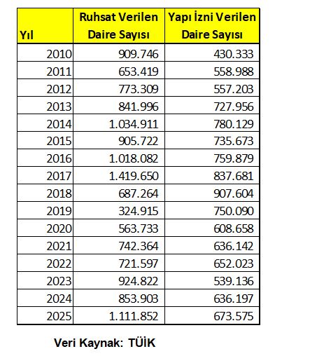2011 yılından itibaren 2025 yılı sonuna kadar -son 15 yılda- yaklaşık 12,58 milyon daire için Yapı Ruhsatı ve 10,36 milyon daire için Yapı Kullanma İzin Belgesi verildiğini görüyoruz. Son 15 yılda inşaat için izin alan mülklerin %17,6 sının iskan almadığını görüyoruz.